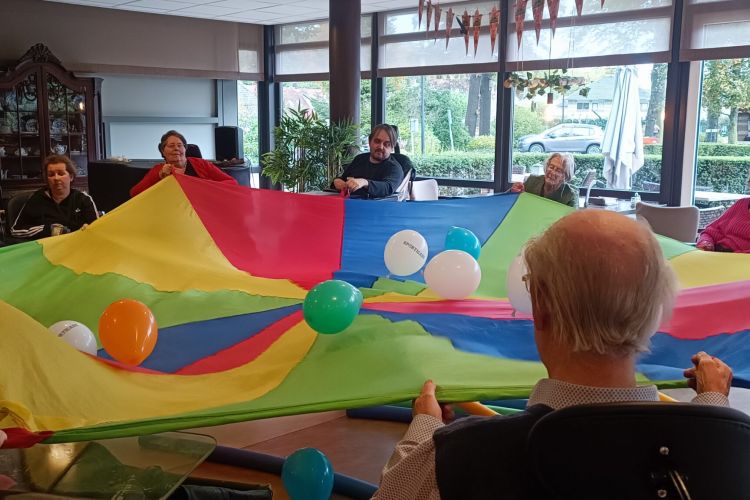 Voor bewoners met een beperking geven we wekelijks de beweegmomenten in de vertrouwde omgeving. Deelnemers bewegen in groepsverband en werken samen en individueel aan een doel. De beweegmomenten zijn elke keer hetzelfde opgebouwd zodat er herkenning en een vast patroon voor de deelnemers aanwezig is. Het programma bestaat uit blokken van 16 weken waarbij verschillende thema’s aan bod komen. Er wordt gebruik gemaakt van diverse materialen zoals stokken, hoepels, ballen, ballonnen en pionnen. Oefeningen worden veelal in spelvorm aangeboden en zijn gericht op verbetering van kracht en uithoudingsvermogen.